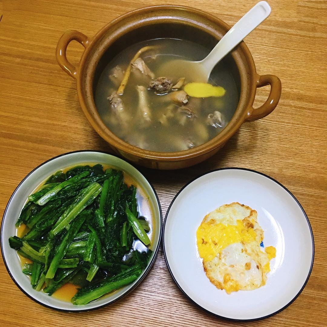 党参黄芪枸杞莲子煲鸡汤~蚝油油麦菜。煎鸡蛋。