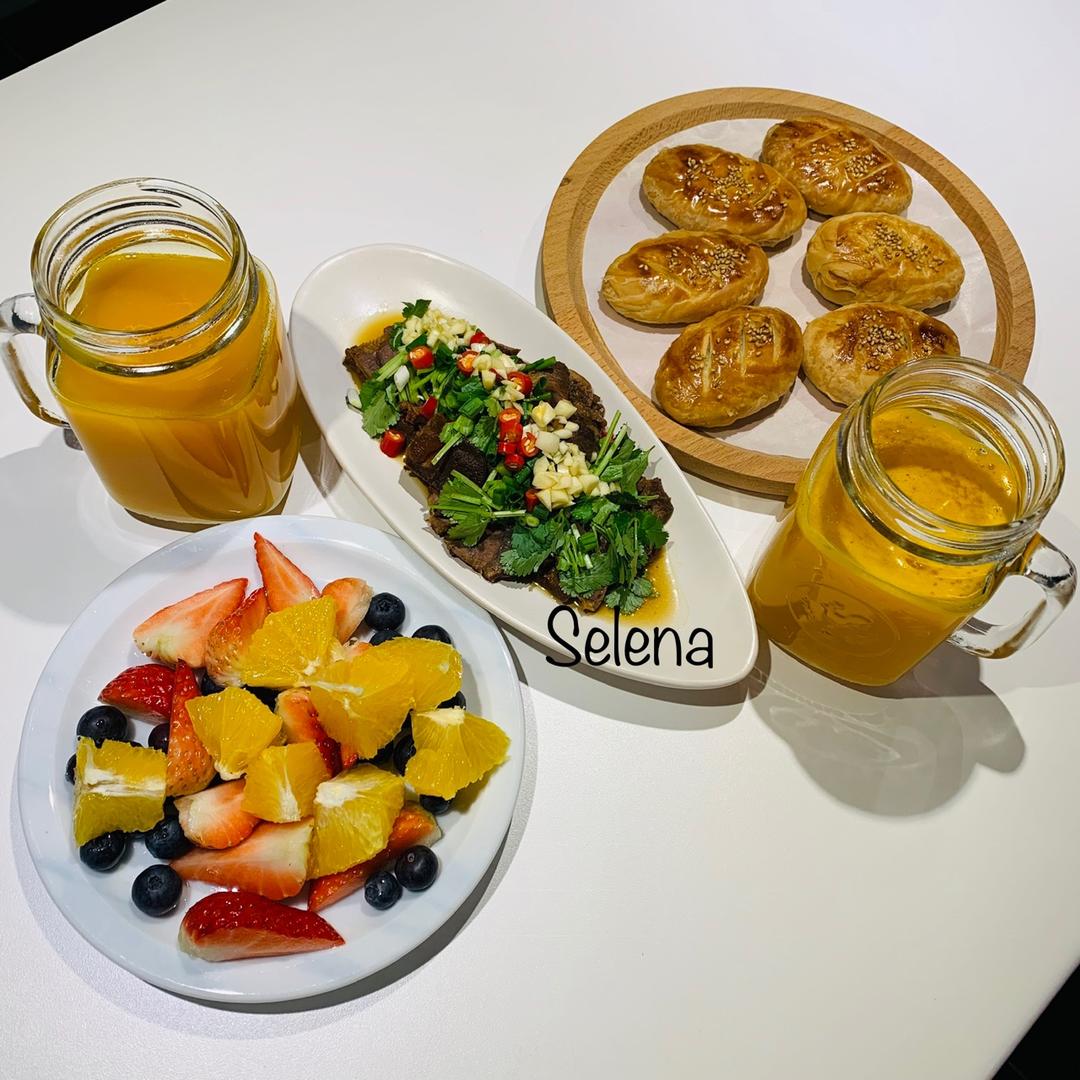 鞋底饼,凉拌卤牛肉,南瓜银耳露,草莓蓝莓橙子拼盘。