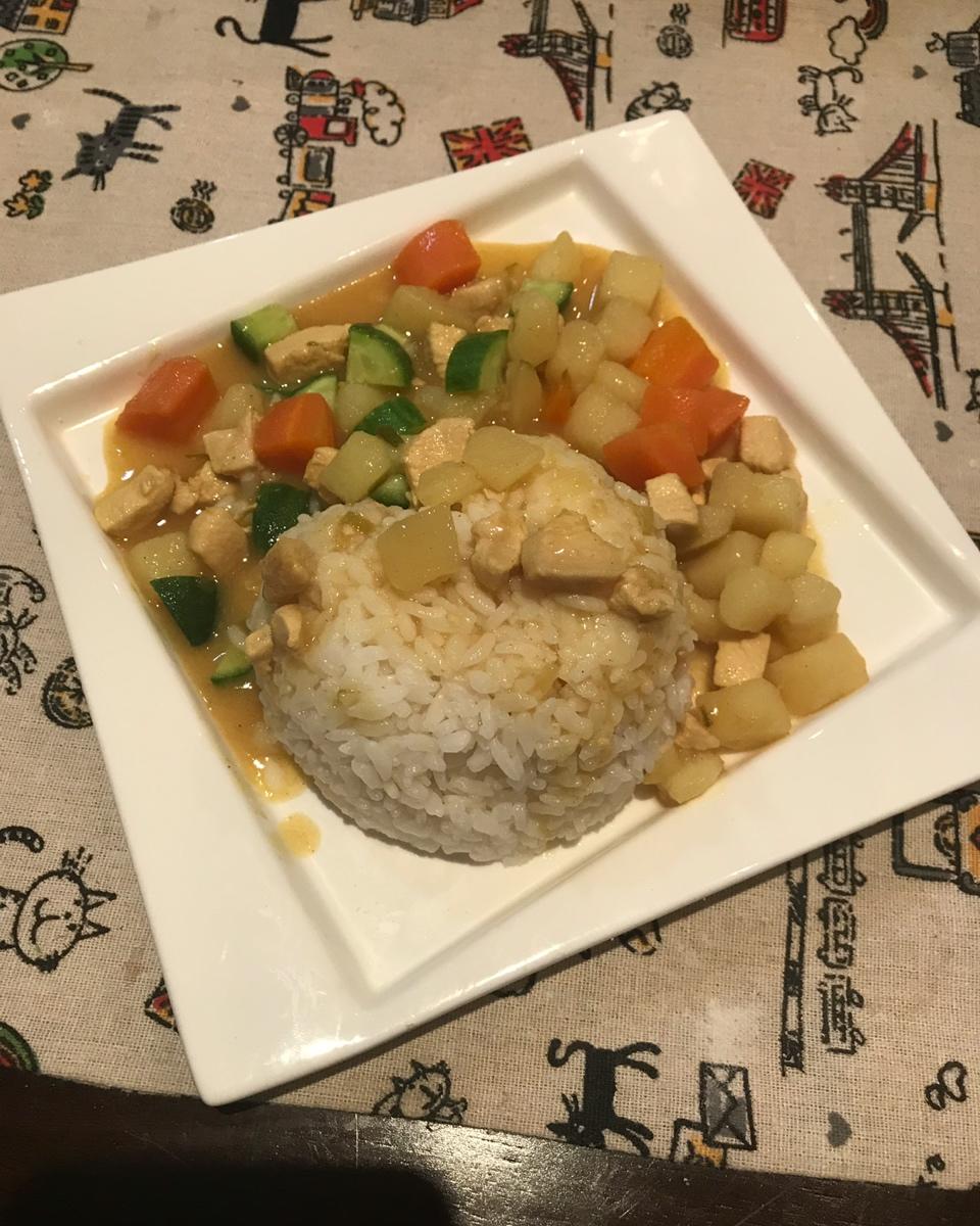 就俩人吃饭,还一人吃一样。我吃咖喱饭娃吃pizza。就这么任性!