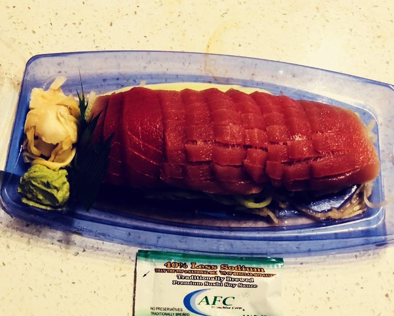 金枪鱼刺身,另外吃了一个奶油奶酪涂红莓贝果