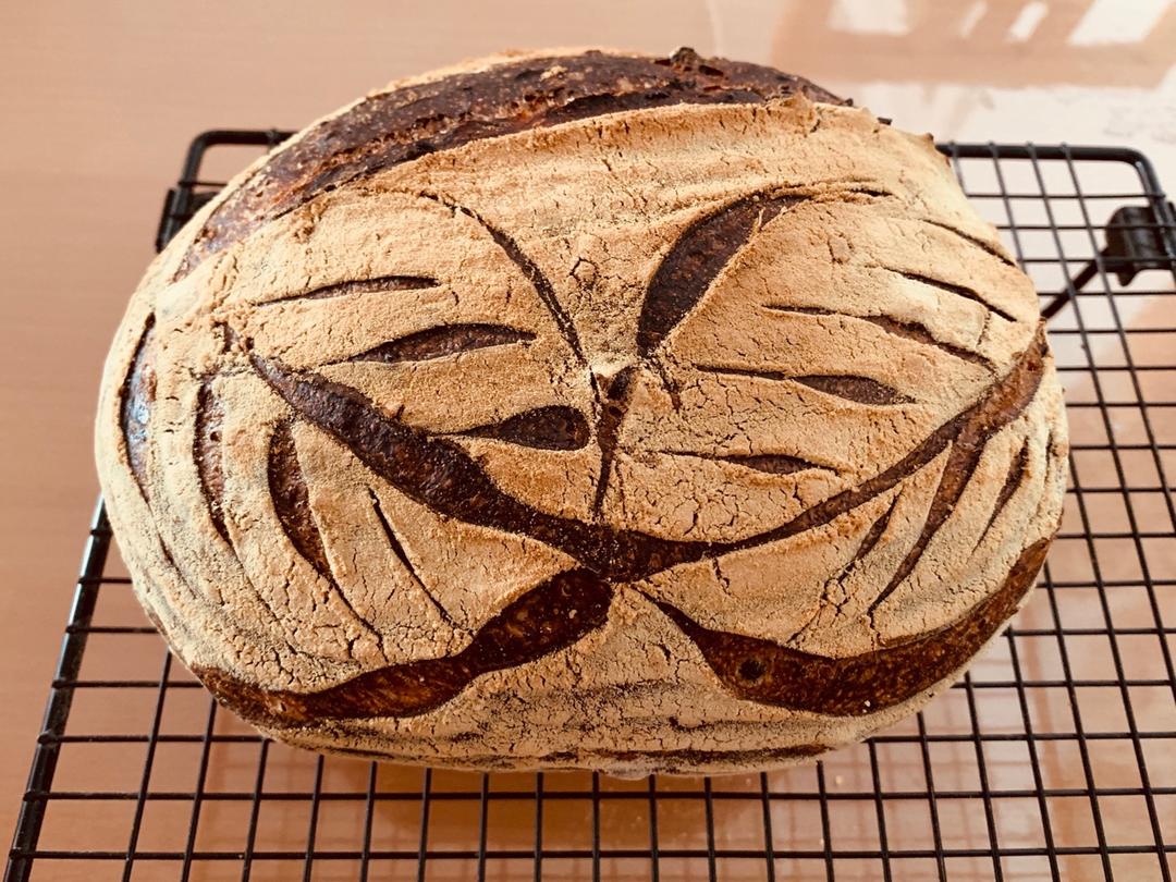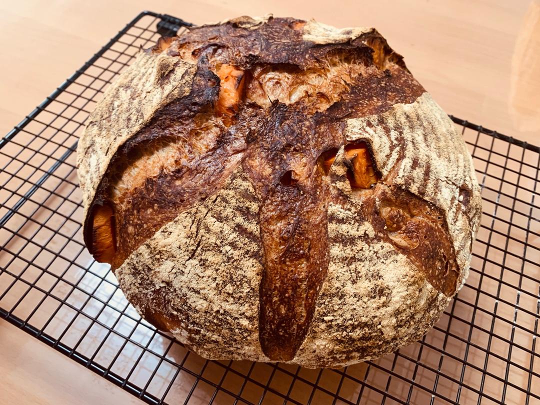 轻全麦酸种欧包 放了点生可可粉做花纹 包了点蒸番薯块儿…