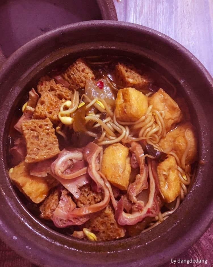 小小砂锅内容不少:猪肚、宁夏粉条、烤麸、豆腐泡、黄豆芽、木耳、香菇、冬瓜...