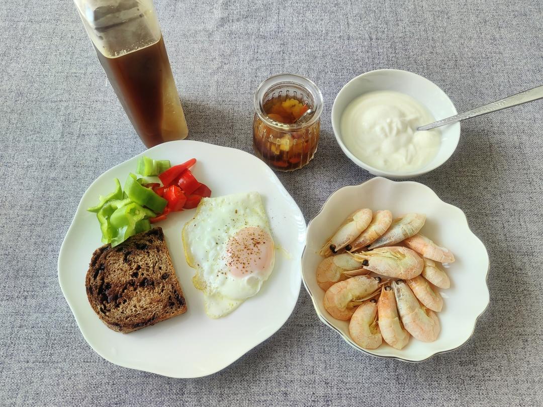 巧克力全麦面包,煎蛋,甜虾,甜椒,银耳炖燕窝,酸奶,冰美式咖啡