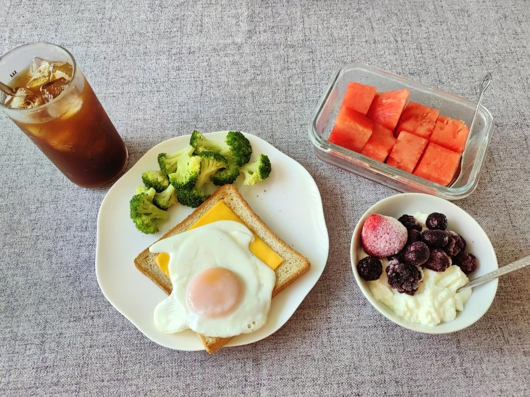 芝士蛋全麦面包,西兰花🥦,希腊酸奶配莓果,西瓜🍉,冰美式咖啡