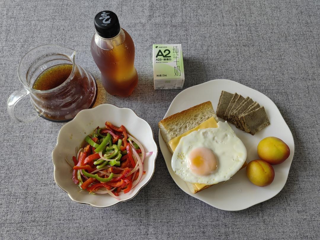 芝士蛋法棍🥖,酱牛肉,青椒拌洋葱丝,杏子,冰美式,牛奶