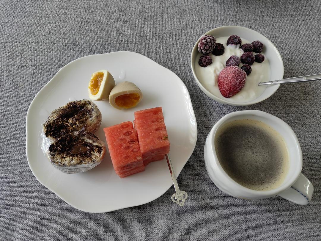 燕麦可可球,溏心蛋,西瓜🍉,酸奶配莓果,咖啡☕
