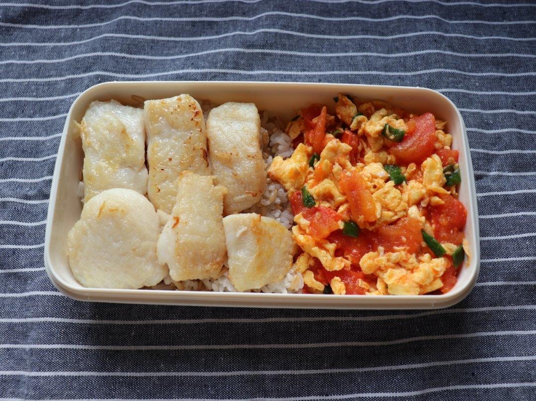 便当|煎巴沙鱼柳,番茄炒鸡蛋,燕麦饭。