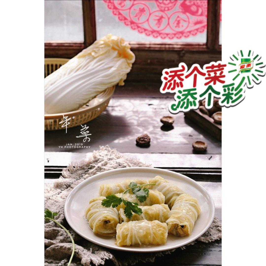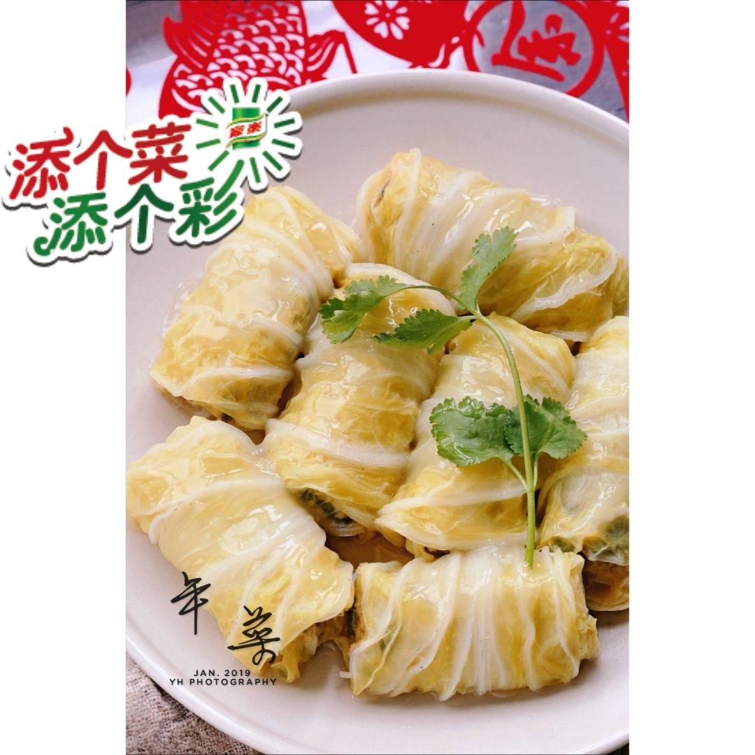 白菜卷,即将荤素裹入白菜内,入锅蒸熟,白菜吸...