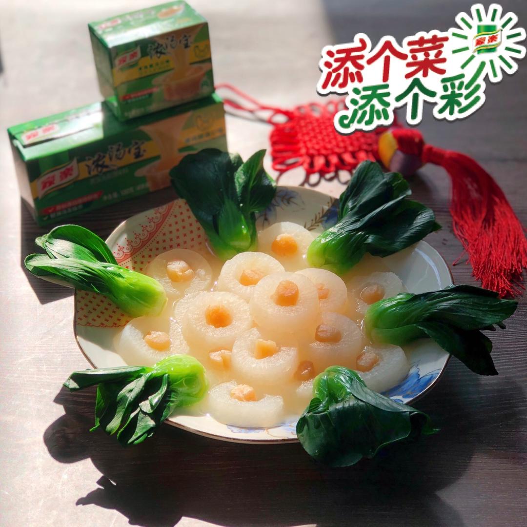 用了家乐浓汤宝兑的浓鸡汁,金灿灿的干贝如同大珠小珠落玉盘般穿入铜钱状的...
