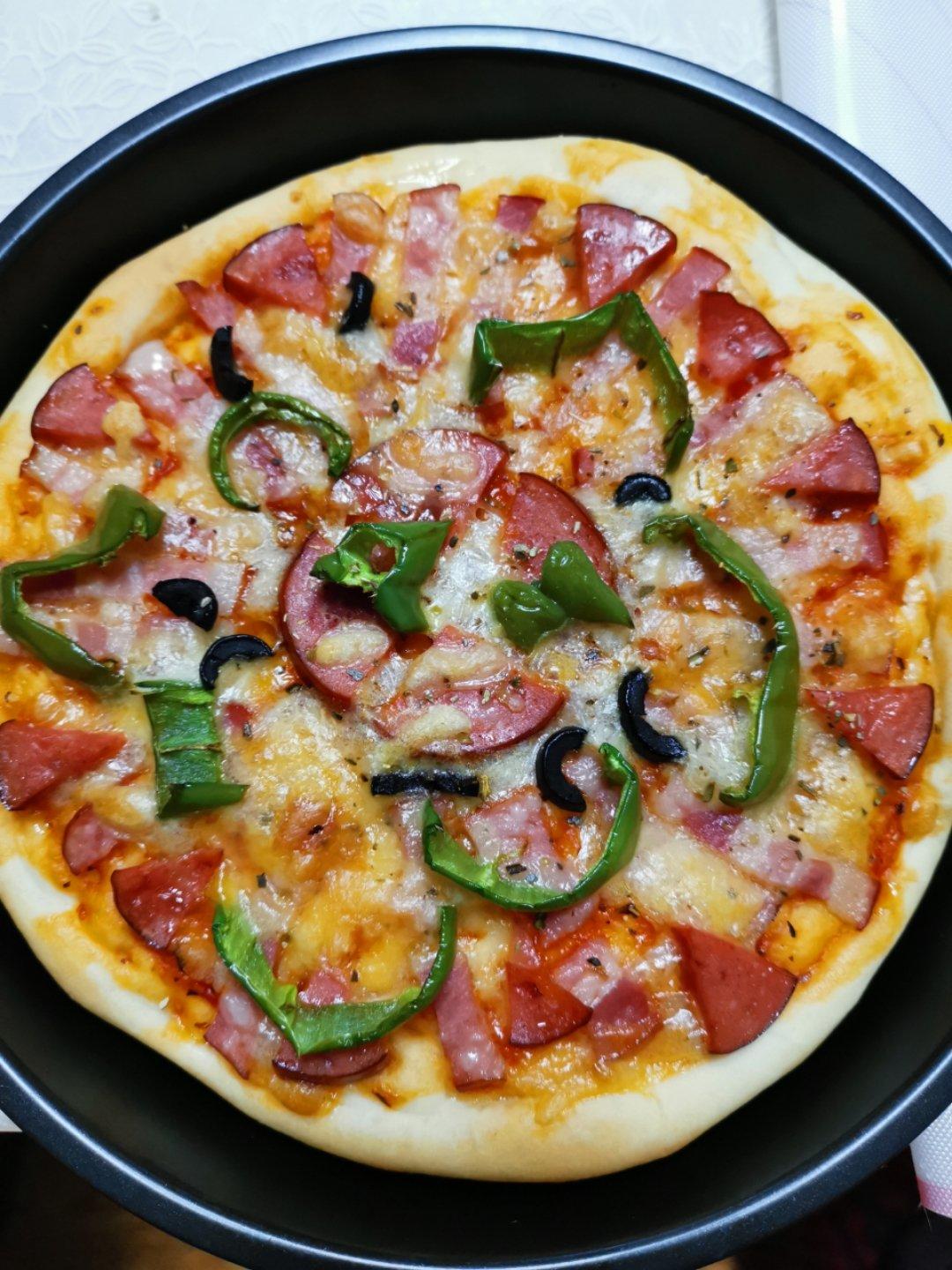 一次做了两个 加的培根和肉肠 很好吃呀。不过披萨酱涂的比较薄 不然会咸~