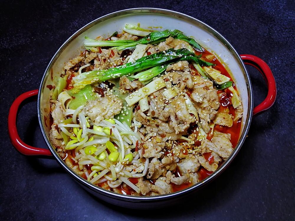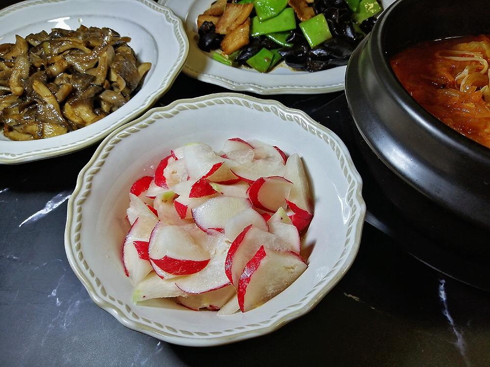 搅拌萝卜、干煸蘑菇、四季豆炒五花肉、韩式泡菜汤
