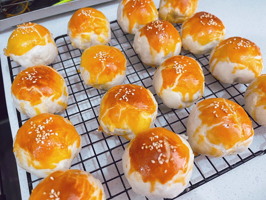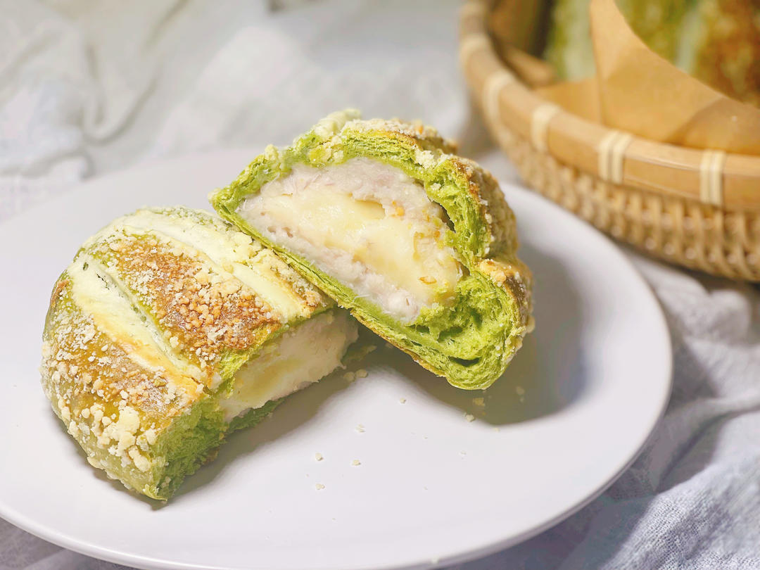 来交个作业,疫情期间,买不到咸蛋黄,就换成了麻薯,加了8克抹茶粉做了抹茶面团,重点是!我没有揉面机,我是用手揉的!38°...