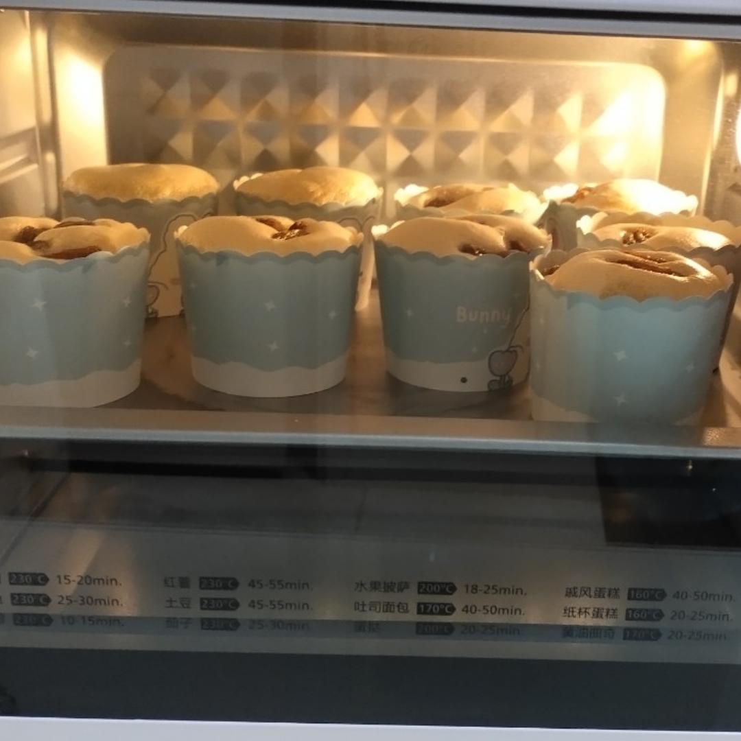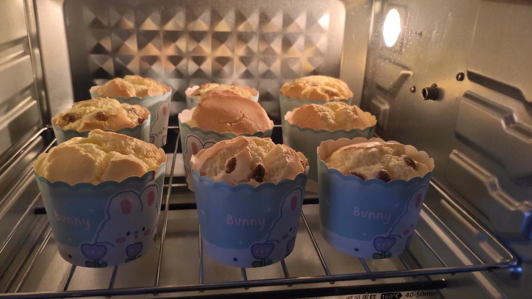 中杯做了9个😁有一个不太满,低温确实是没有开裂烤糊的情况,膨出也挺完美的,就是没有裱花袋手忙脚乱的,想着孩子喜欢吃葡萄干...