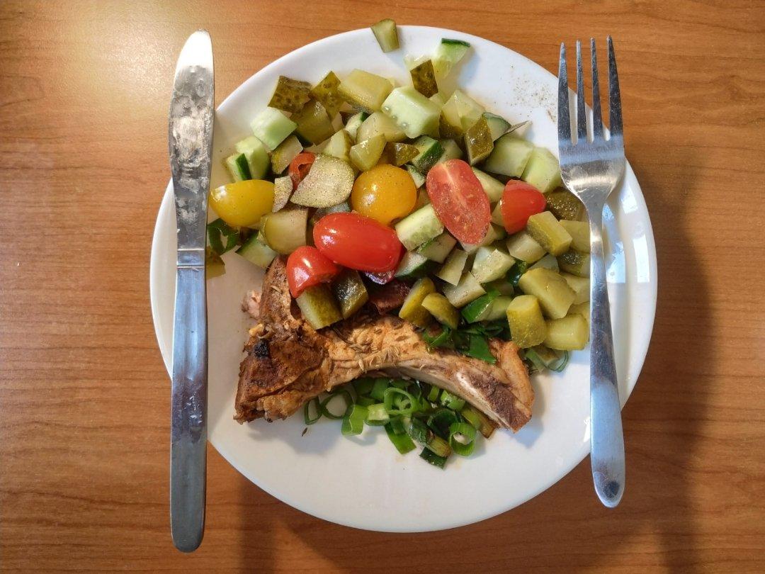 猪排还是老样子煎法,醋香料盐腌后煎。酸黄瓜是今日的最爱,拌小番茄和黄瓜一级棒。