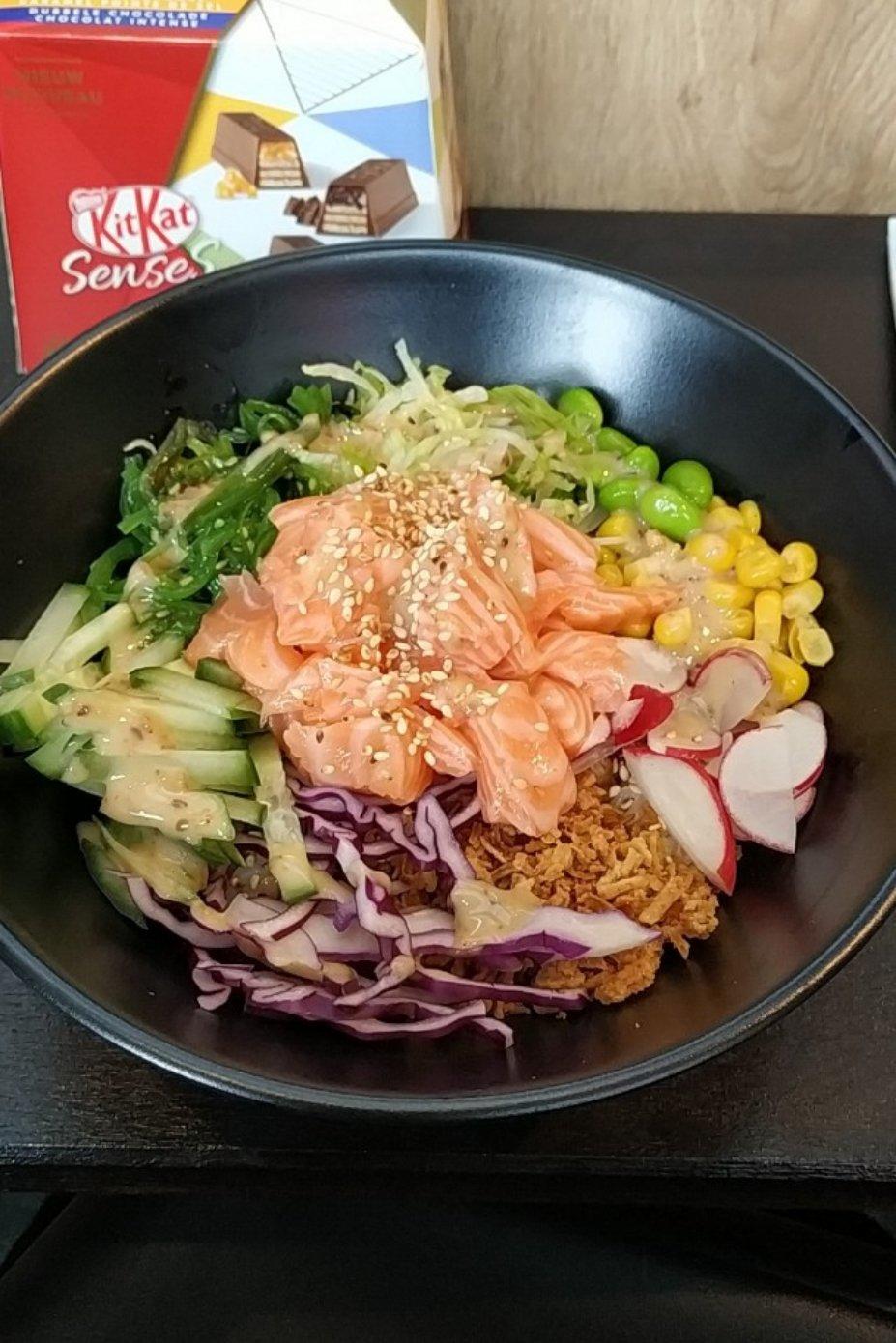 商场里面的三文鱼拌饭,鱼生真的是爆炸式幸福,还有蔬菜配在一起...