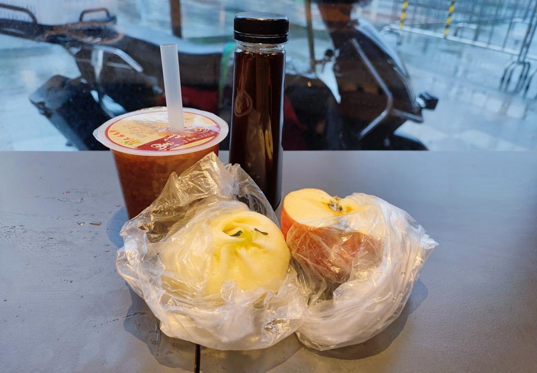 菜包,八宝粥,苹果,咖啡