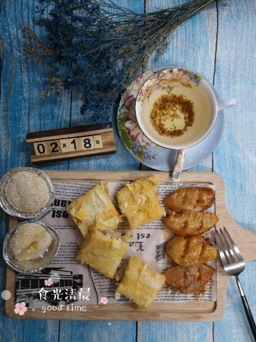 跟着君之的方子做的芒果糯米糍、香蕉泥西多士、烤鸡翅、芒果百香果茶