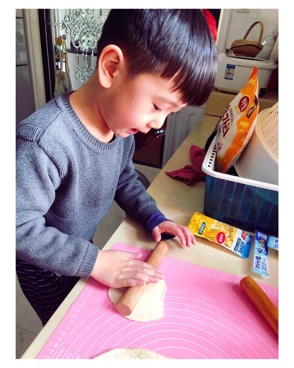 起来和小阿蛋一起做了香肠芝士披萨...