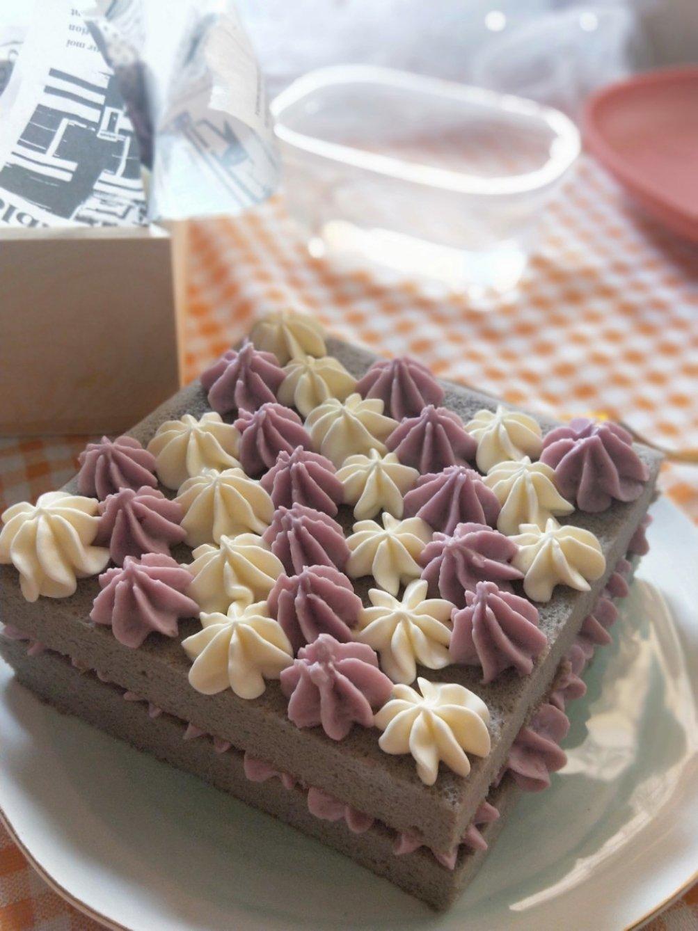 芋泥紫薯完美搭配,这颜色大爱。方子很好,厚实绵软的蛋糕体