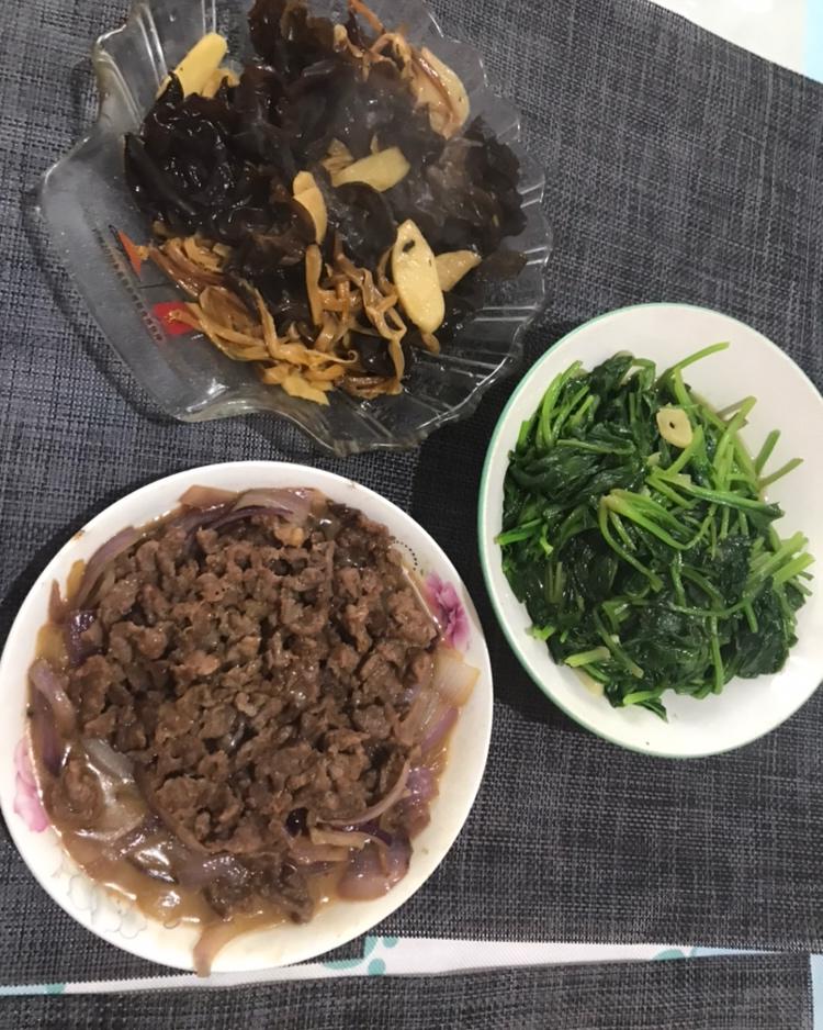 记录一下今天的午餐:牛肉炒洋葱、木耳针菜炒淮山、清炒波菜。