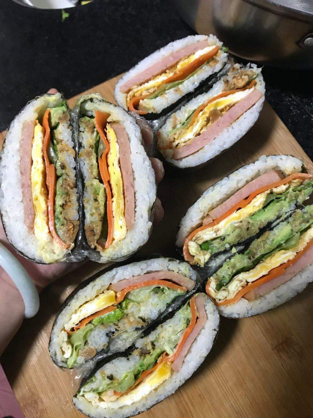 哥俩喜欢的煎蛋,午餐肉,胡萝卜,生菜,牛油果,肉松,沙...