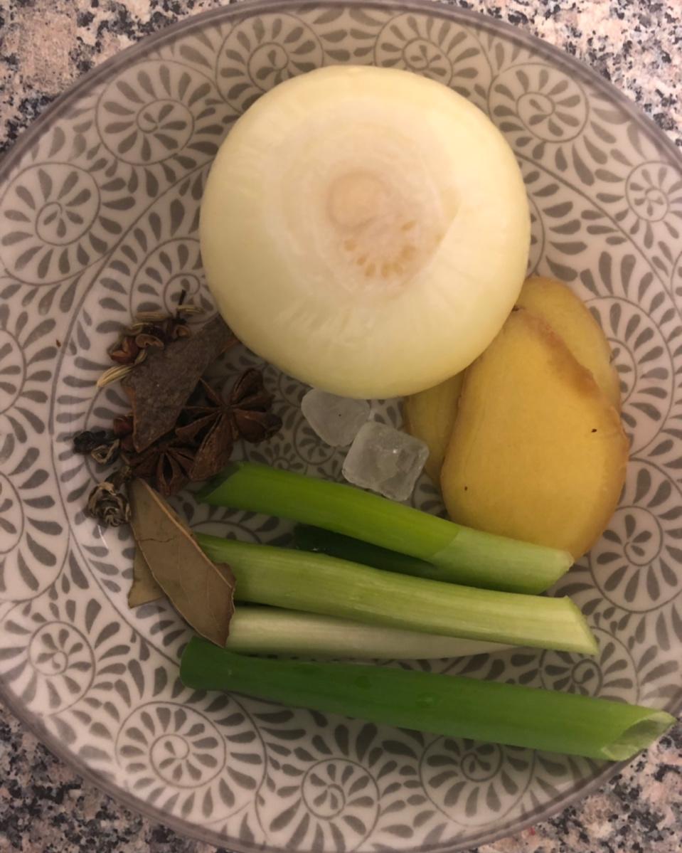 清汤牛肉面,加了蛋饺和肉圆(因为昨天馄饨剩了肉馅😬)