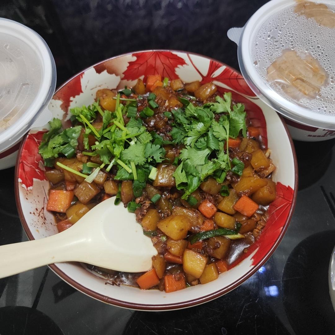 天天不做饭的我突然来了兴致,做了一个土豆肉沫,拌米粉,哇,好好吃~