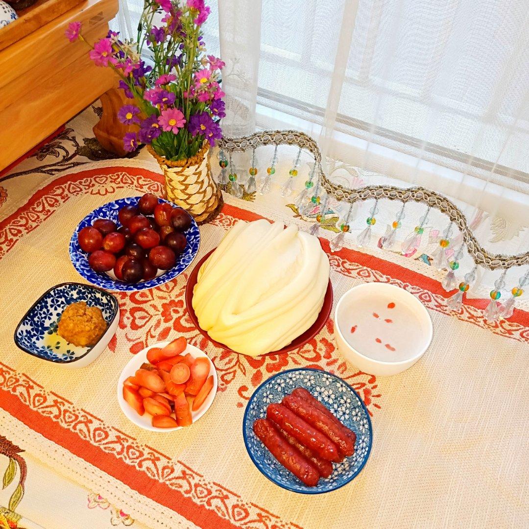 周五早餐:红豆薏仁枸杞牛奶糊+大花卷+小香肠+炝拌水果胡萝卜+丸子+红提子