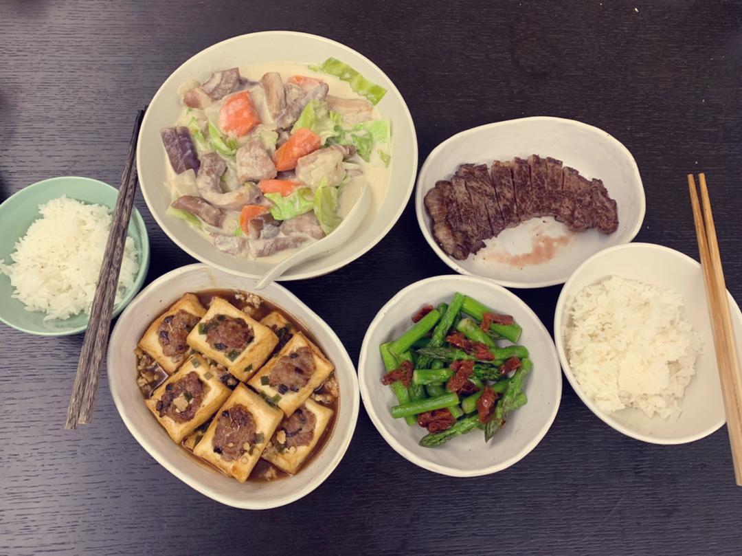 酿豆腐,猪肉蔬菜咖喱,煎牛排,番茄干炒芦笋