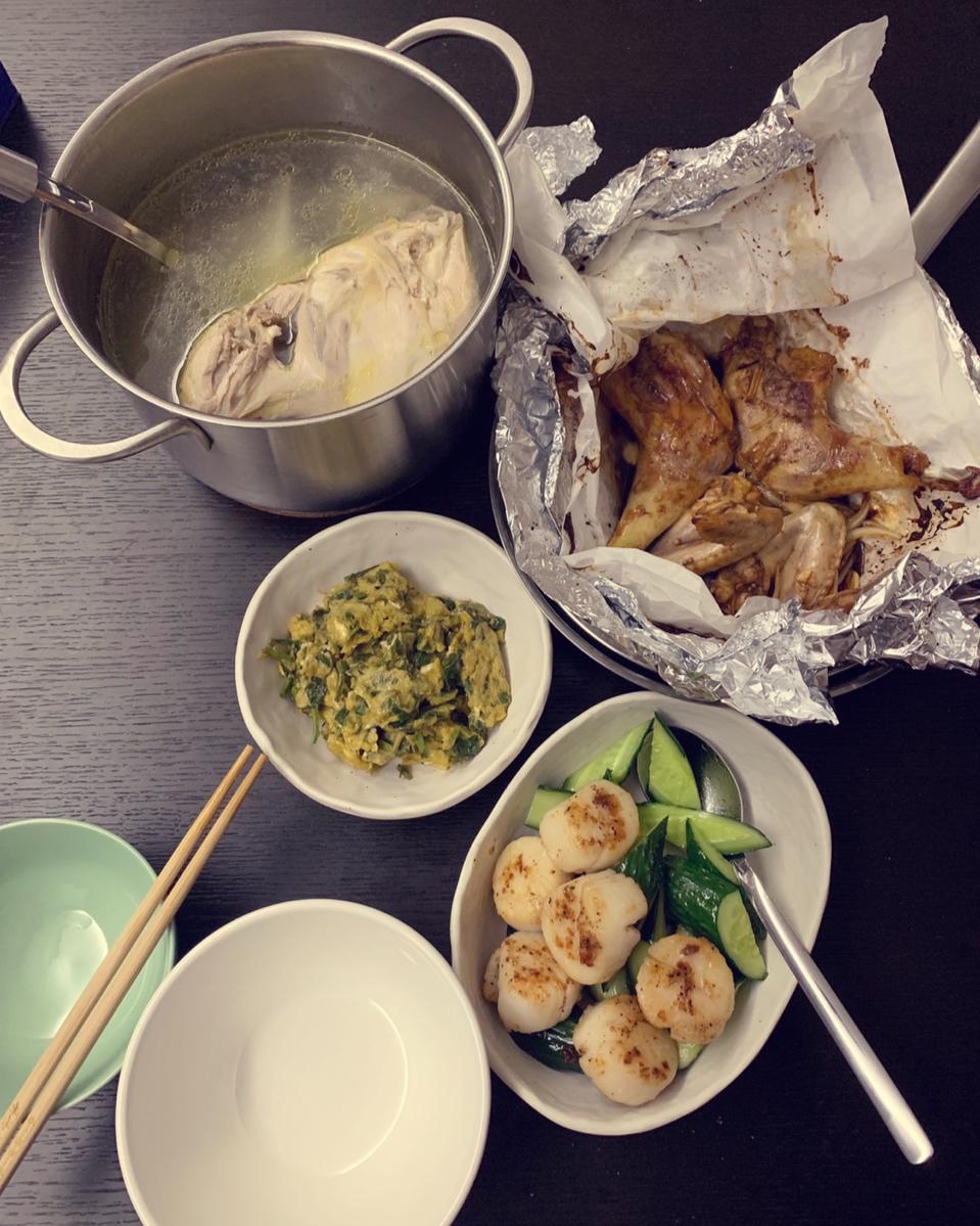 烤鸡,鸡汤,香椿炒蛋,煎带子,炒青瓜,一个都不饿的快速晚餐