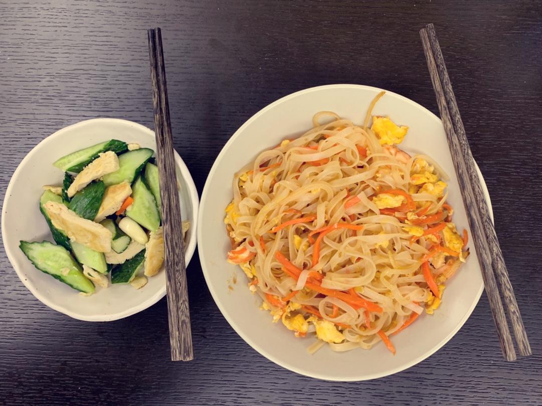 昨晚的冻豆腐炒青瓜,pad thai:泡粉半小时,炒菜五分钟