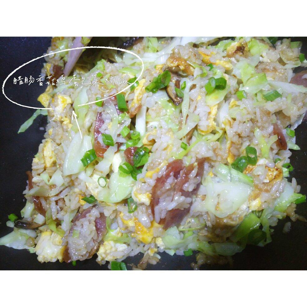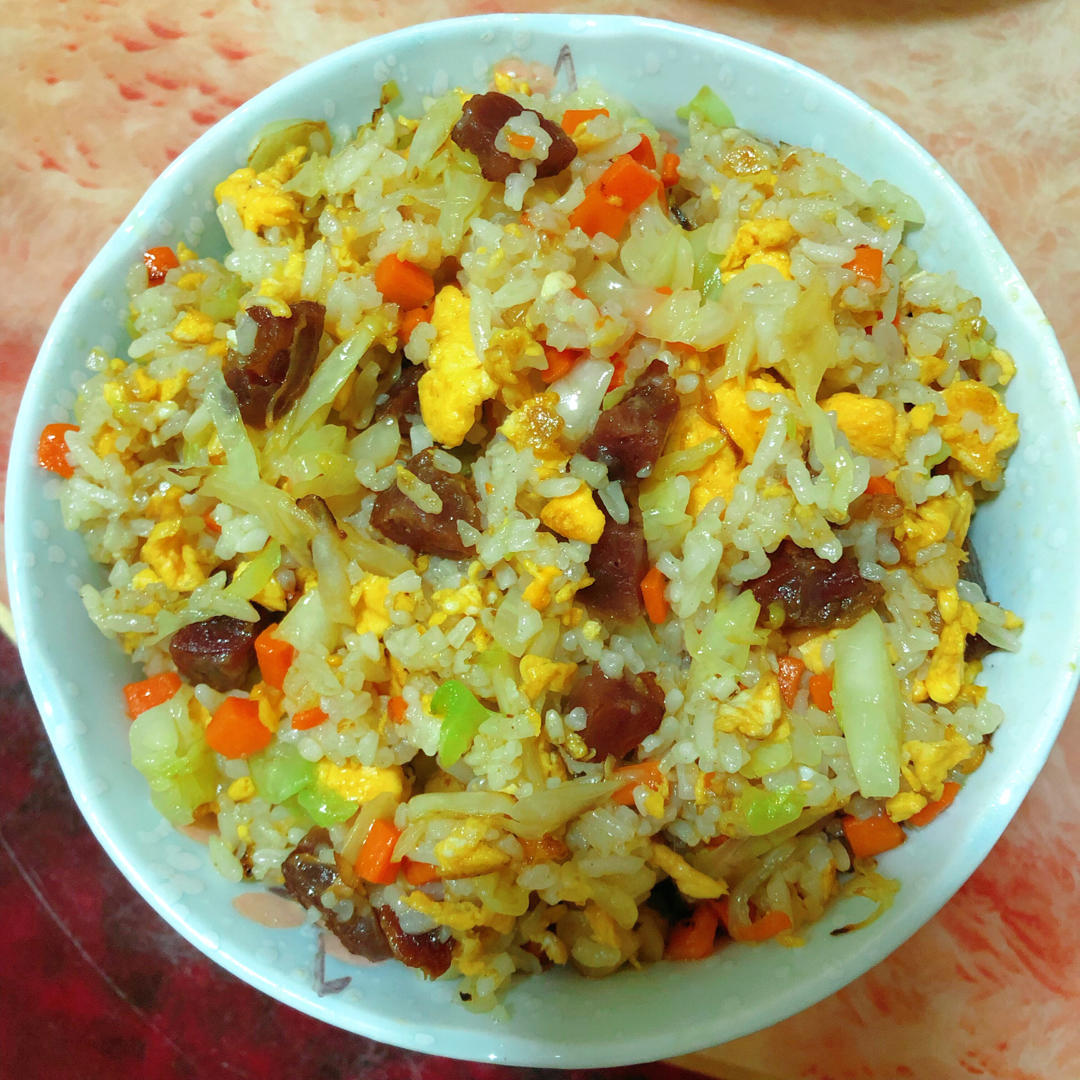 宝贝心心念念的腊肠炒饭,加了包菜,香菇,鸡蛋 ,好吃可以吃第二碗
