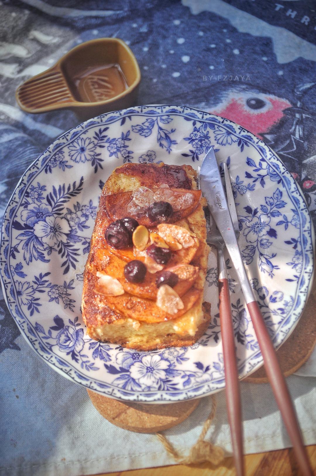 肉桂苹果法式吐司,蒸南瓜,芹菜紫甘蓝苹果酸奶饮。吐司浸泡好几天了,先煎再铺上炒过的肉桂苹果一起烤,太香了,一大锅就剩了这...