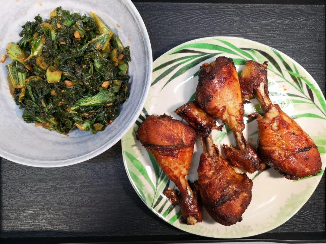 烤鸡腿,辣炒羽衣甘蓝