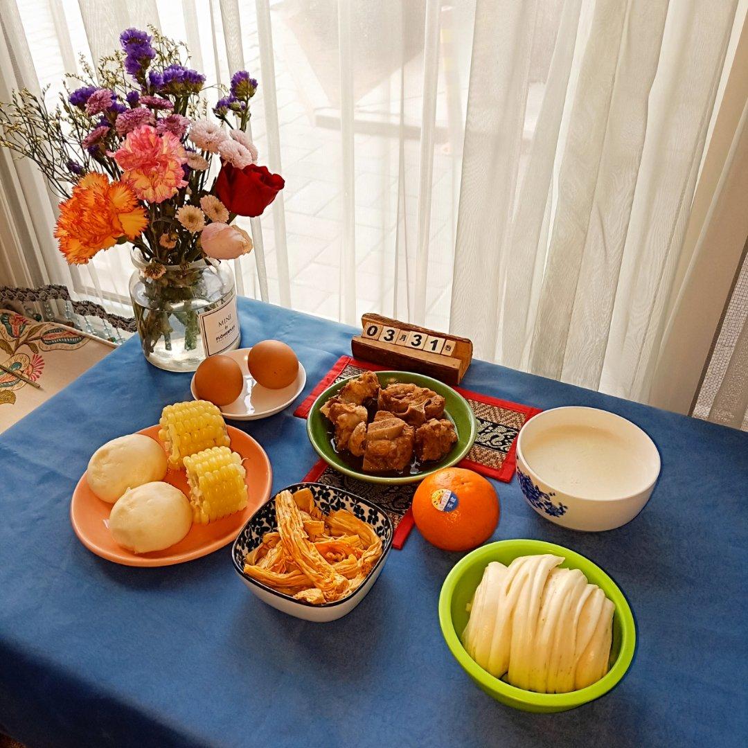 周日早餐:牛奶麦片粥+奶黄包+糯玉米+排骨+绝味鸭脖的腐竹+鸡蛋+褚橙