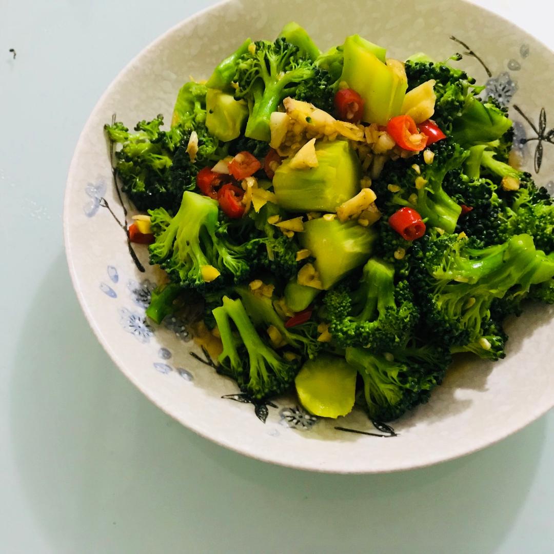 西蓝花焯水快速捞出,少量油爆香姜蒜辣椒,下西蓝花酱油一点点料酒,快速捞一捞出锅