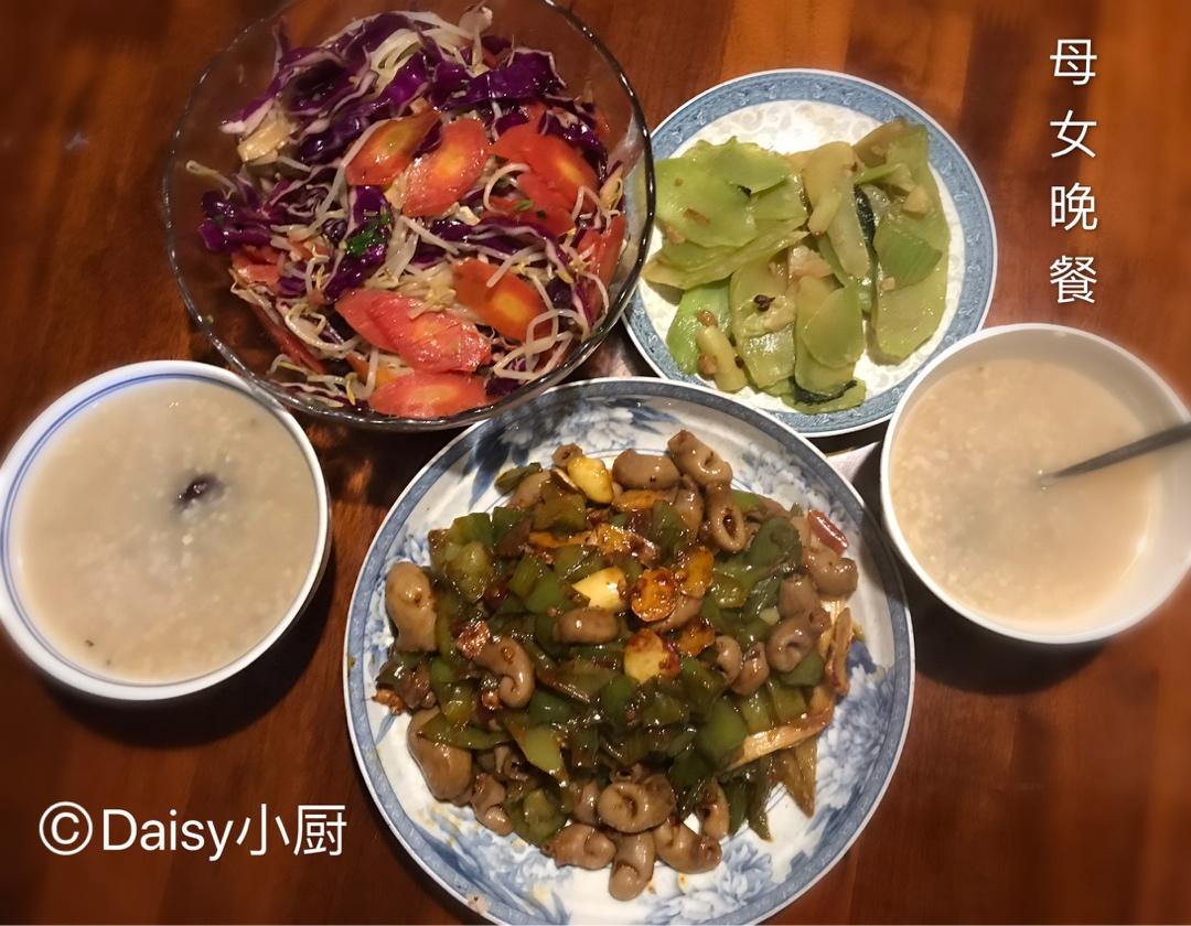 母女俩的晚餐:青椒爆鱼肚,大拌菜(豆芽,胡萝卜,紫甘蓝),炝炒莴笋,红枣八宝粥。