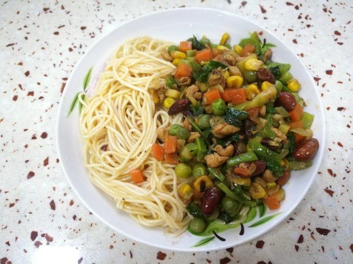 炒三丁拌面(盖浇面):鸡丁,豌豆,玉米,胡萝卜丁,香菇丁,青红椒丁,莴笋丁,花生米,韩式辣...