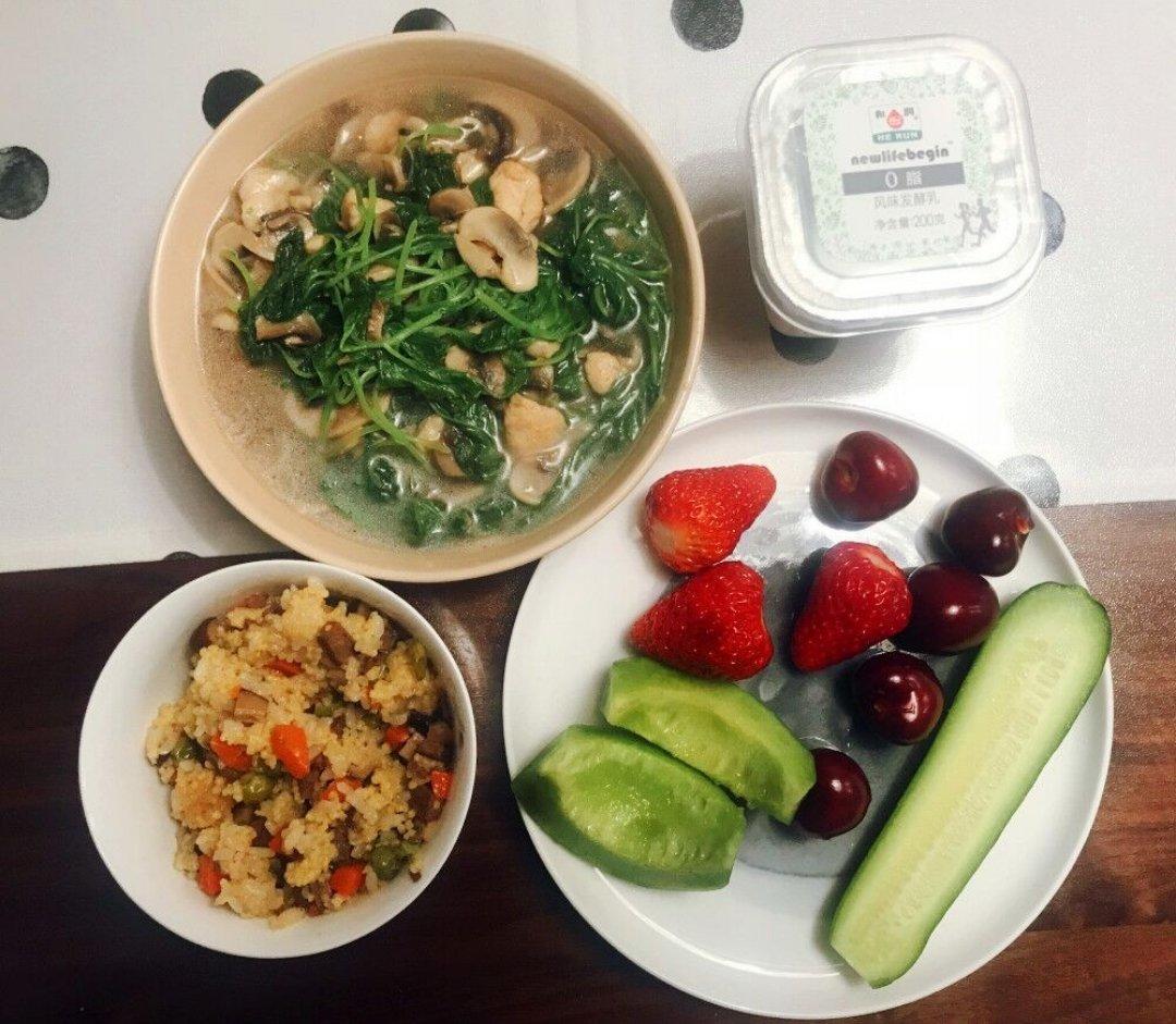 牛肉香菇胡萝卜豌豆焖饭、鸡肉蘑菇煮苋菜、香瓜草莓樱桃黄瓜、脱脂无...