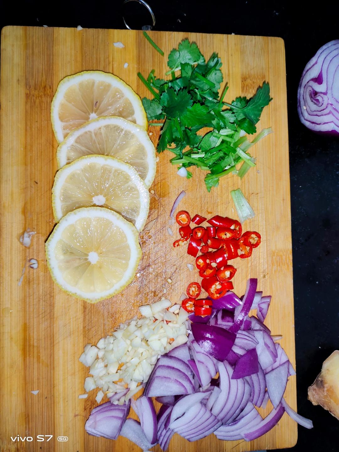 无骨鸡爪煮十分钟冲洗一遍,泡凉水,半个小时,柠檬切片,蒜切末,香菜切段,洋葱切块,小米辣切...