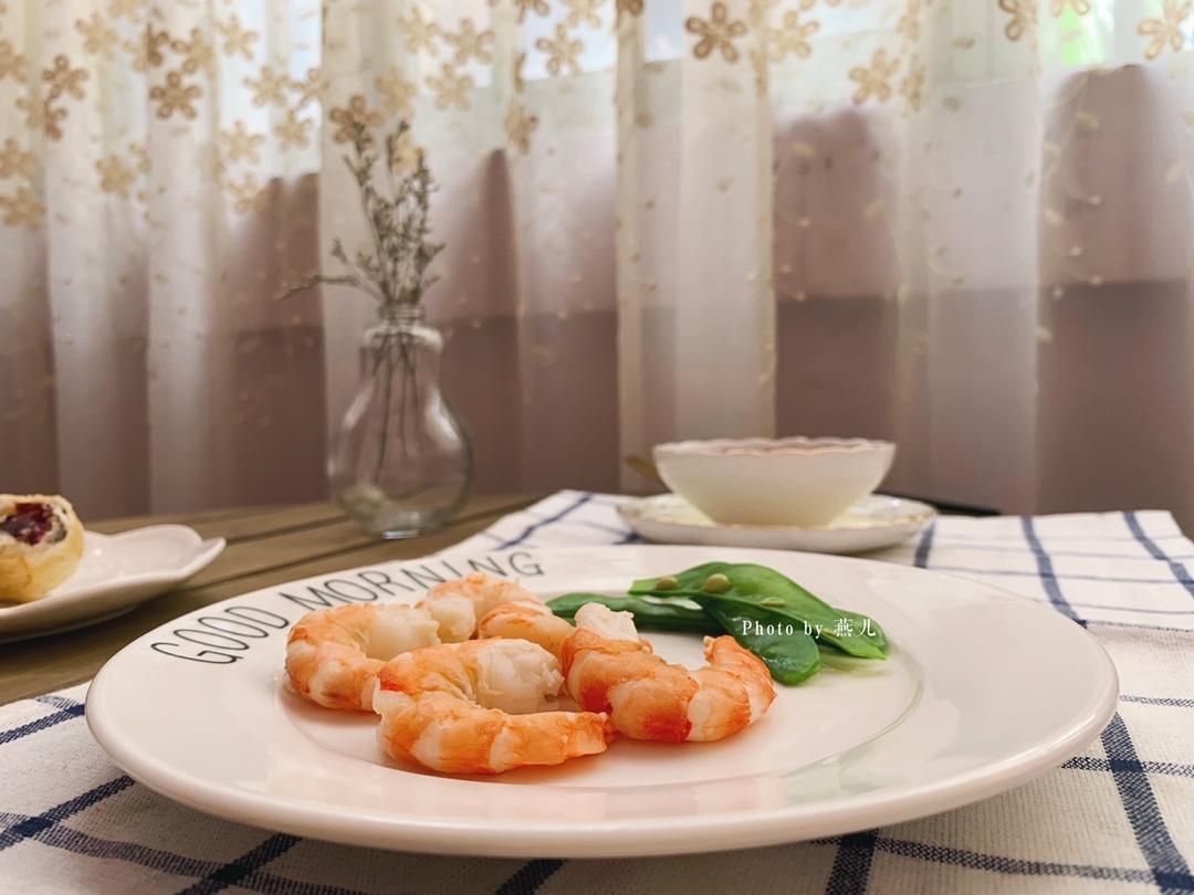 水煮黑虎虾、鲜花饼、紫薯燕麦豆浆