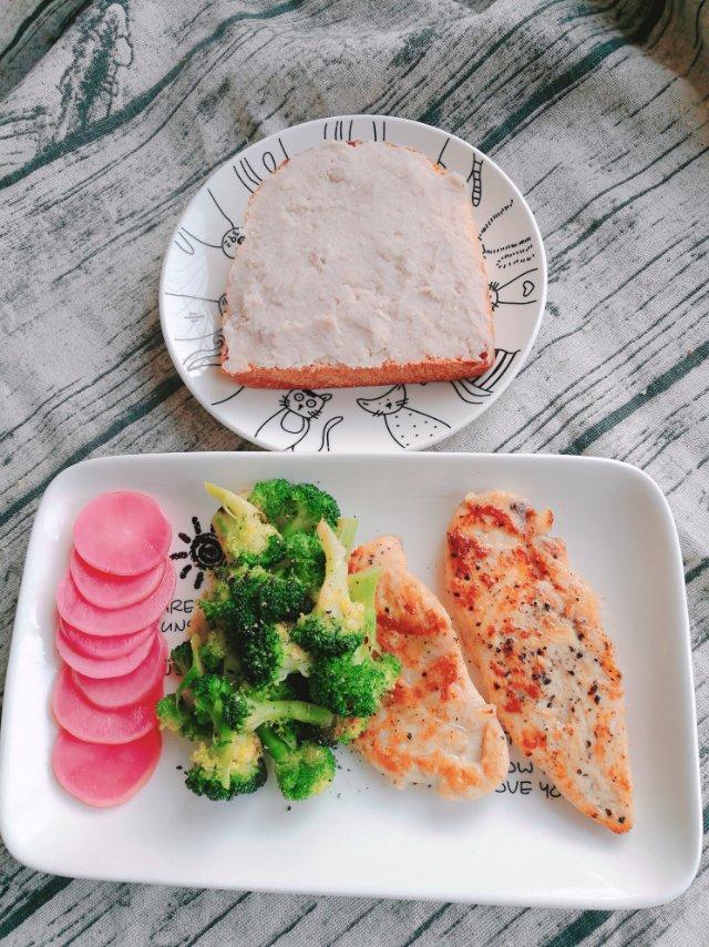 酸奶芋泥吐司,煎鸡胸,酸甜樱桃萝卜,西兰花,早!
