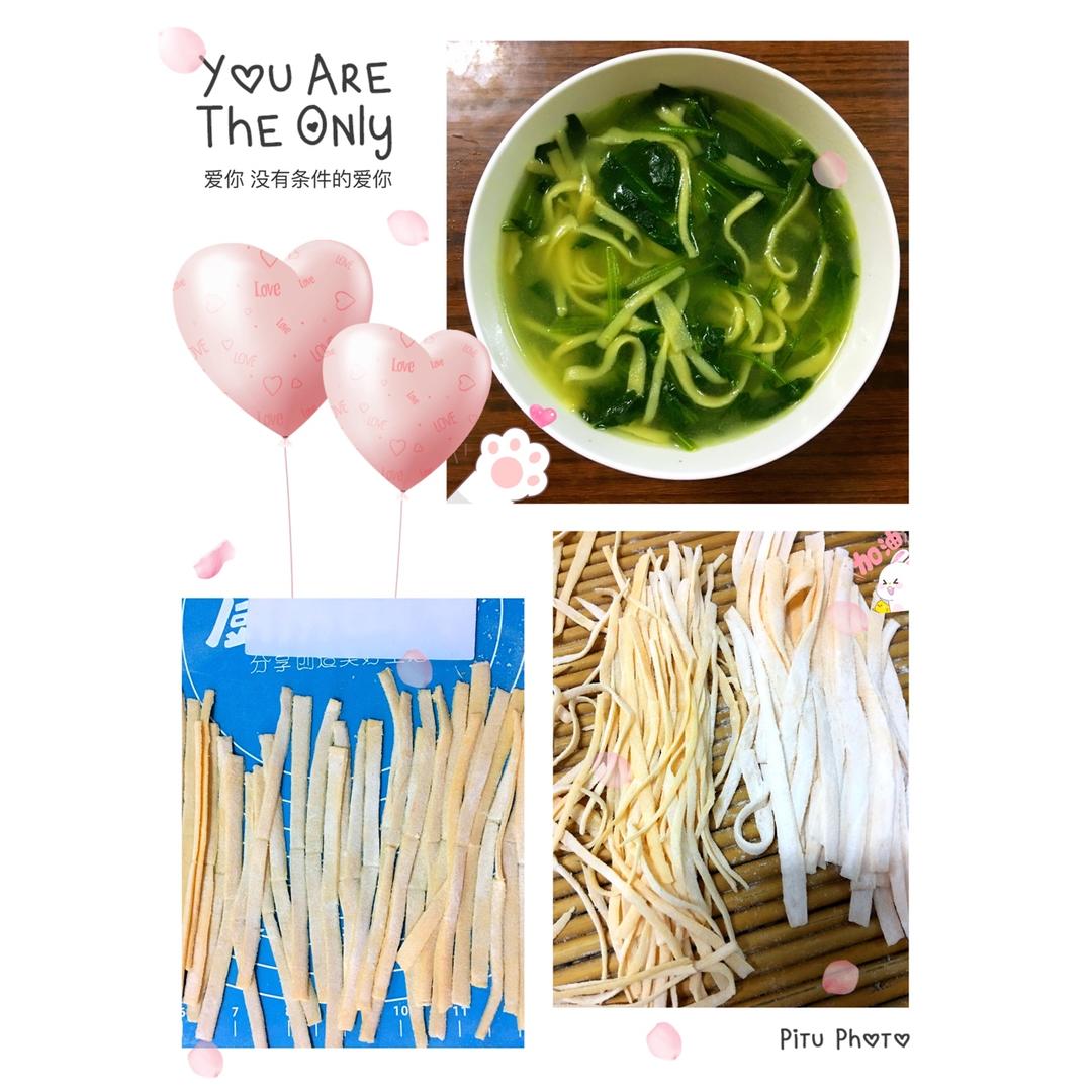 小王子不爱吃菜,于是我就把胡萝卜洗净切片、煮熟、榨成泥、和面,做手擀面。又有营养又有色彩。