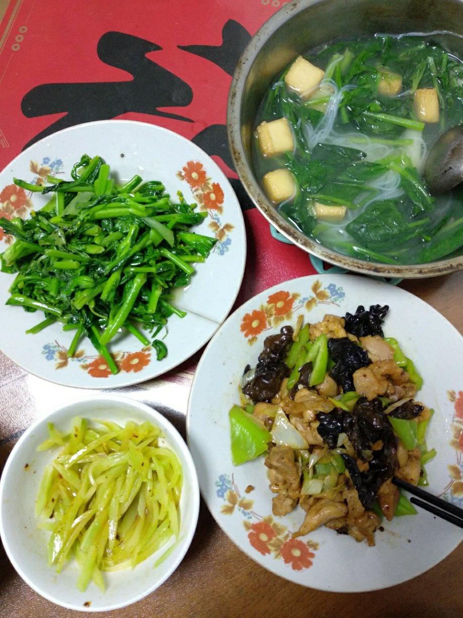 我爱炒菜苔,儿子爱小炒鸡腿肉。最后光盘就是了。