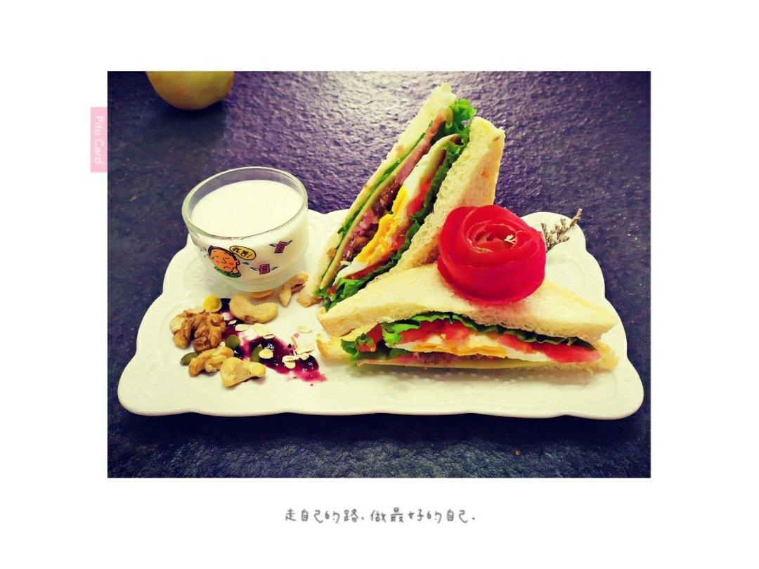 这款超大美味的三明治,是由妈妈煎肉,宝宝组合起来的,搭配上热牛奶,胡萝卜苹果汁,超级满足,补充能量,荤素搭配营养丰富!