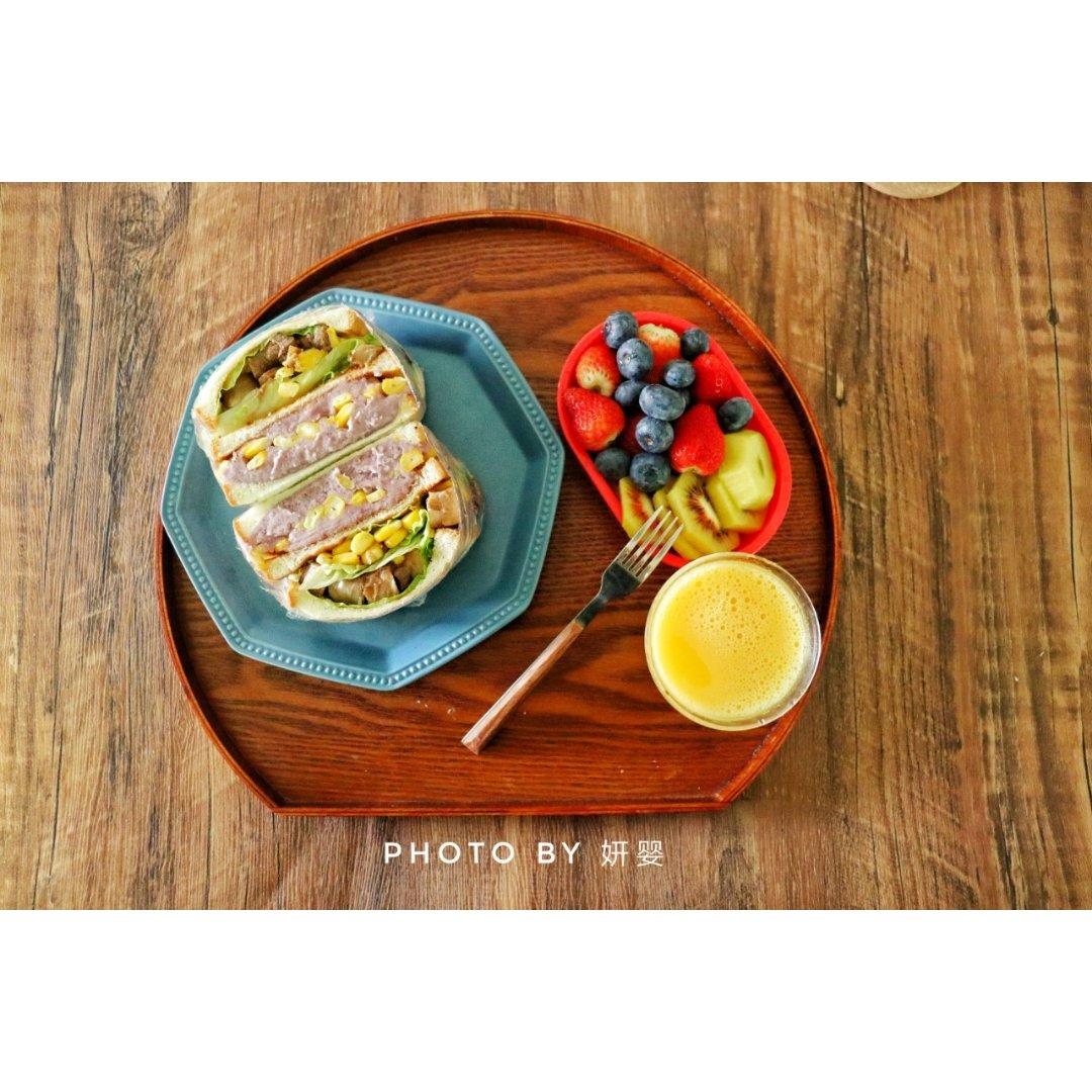 今日早餐:芋泥牛排三明治+胡萝卜玉米🌽汁+🍓…🥝蓝莓