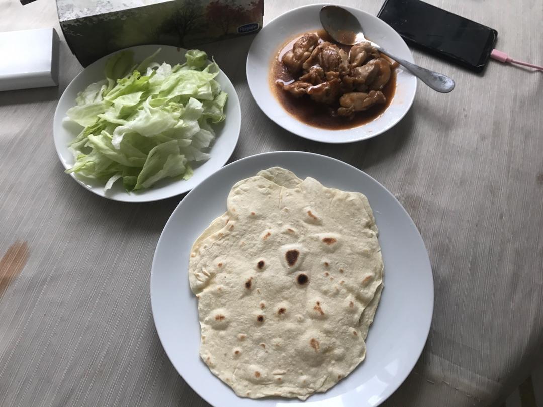 第一次做墨西哥卷饼,配上照烧鸡腿肉、生菜和沙拉酱超好吃😋😄