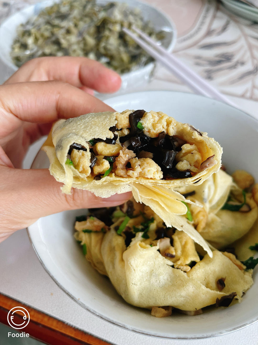 咸宁煎饼!小米煎饼裹上自家香菜+妈妈招牌香菇,香上加香,太香了!