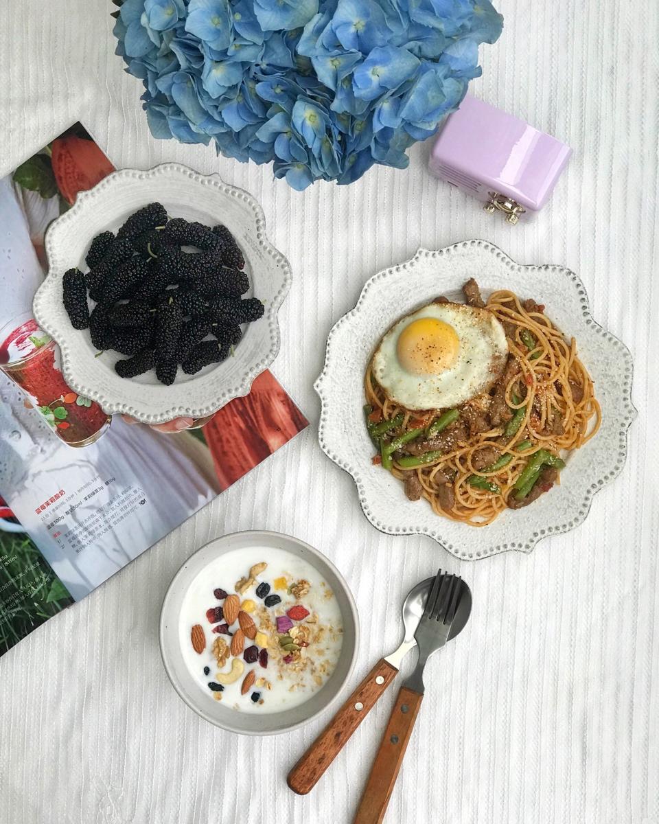 牛奶燕麦坚果、牛柳煎蛋芦笋意面、桑葚