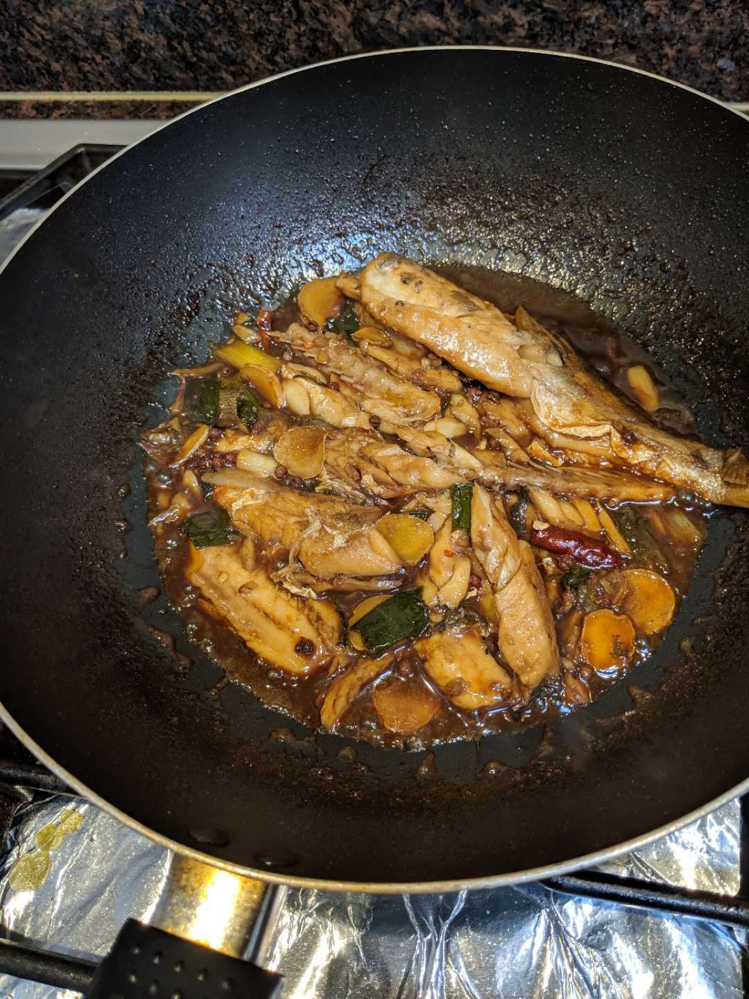 还是加了一点老抽,感觉颜色上会更好看一点,凭感觉放的调料,味道还是稍微淡了一点,但是蘸着汤汁吃还不错。煎鱼还是把握不太好...